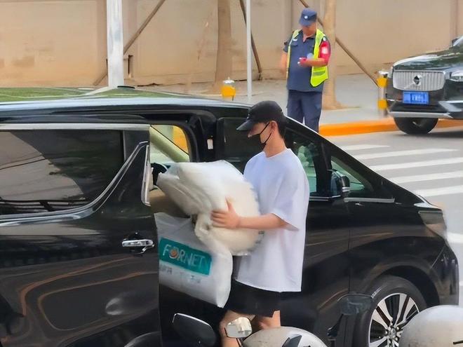 而另一张照片,则是他外出清洗被子时被拍到的,邓伦穿着大 T 恤,双手抱着被子,看起来非常辛酸。
