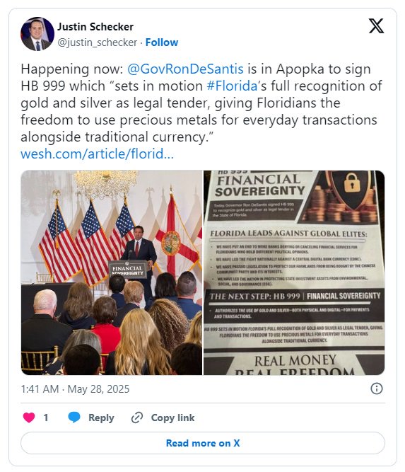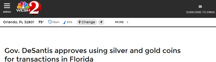 这项立法承认黄金和白银为该州的法定货币,从而启动在佛罗里达州使黄金和白银成为法定货币的进程。
