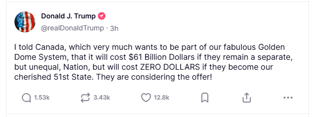 当天,特朗普在其社交媒体平台Truth Social上发帖说,“加拿大非常希望成为我们金色穹顶计划的一部分。我告诉加拿大,如果他们仍然是一个独立但不平等的国家,这将花费610亿美元,但如果他们成为我们珍爱的第51个州,这将花费零美元。”